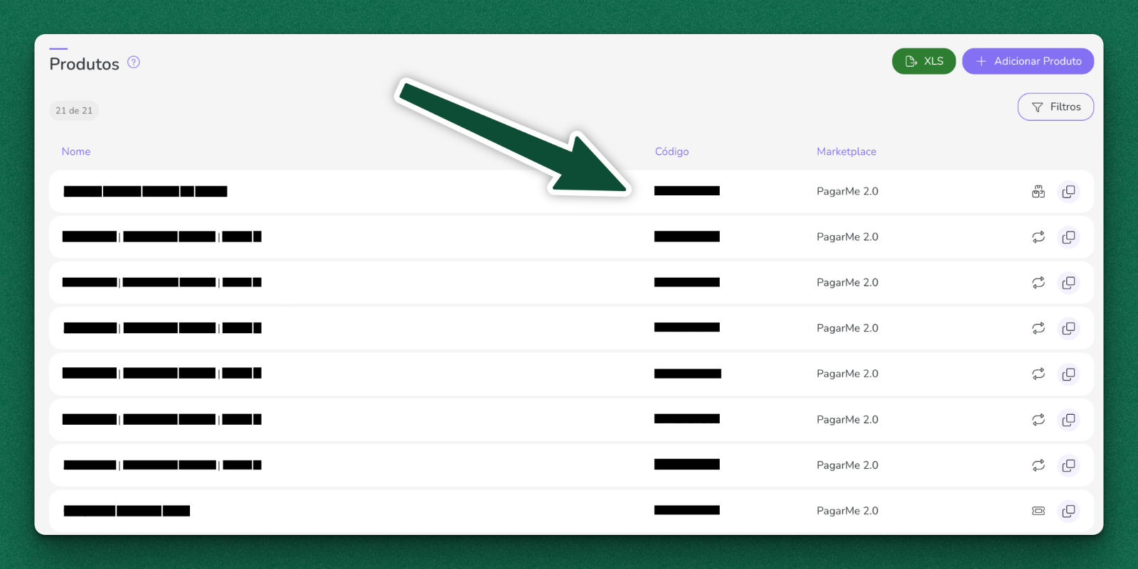 *Para saber o ID do produto, clicar em “produtos” na barra lateral esquerda e pegar o numero que está na coluna “Código” referente à oferta que você criou.