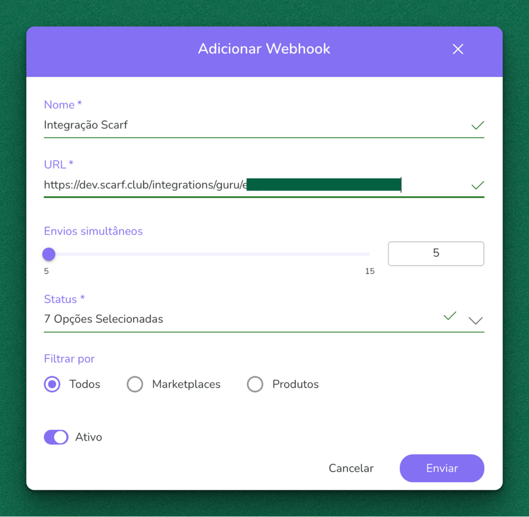 URL para envio de dados: Cole o link que você copiou da Scarf no Passo 1